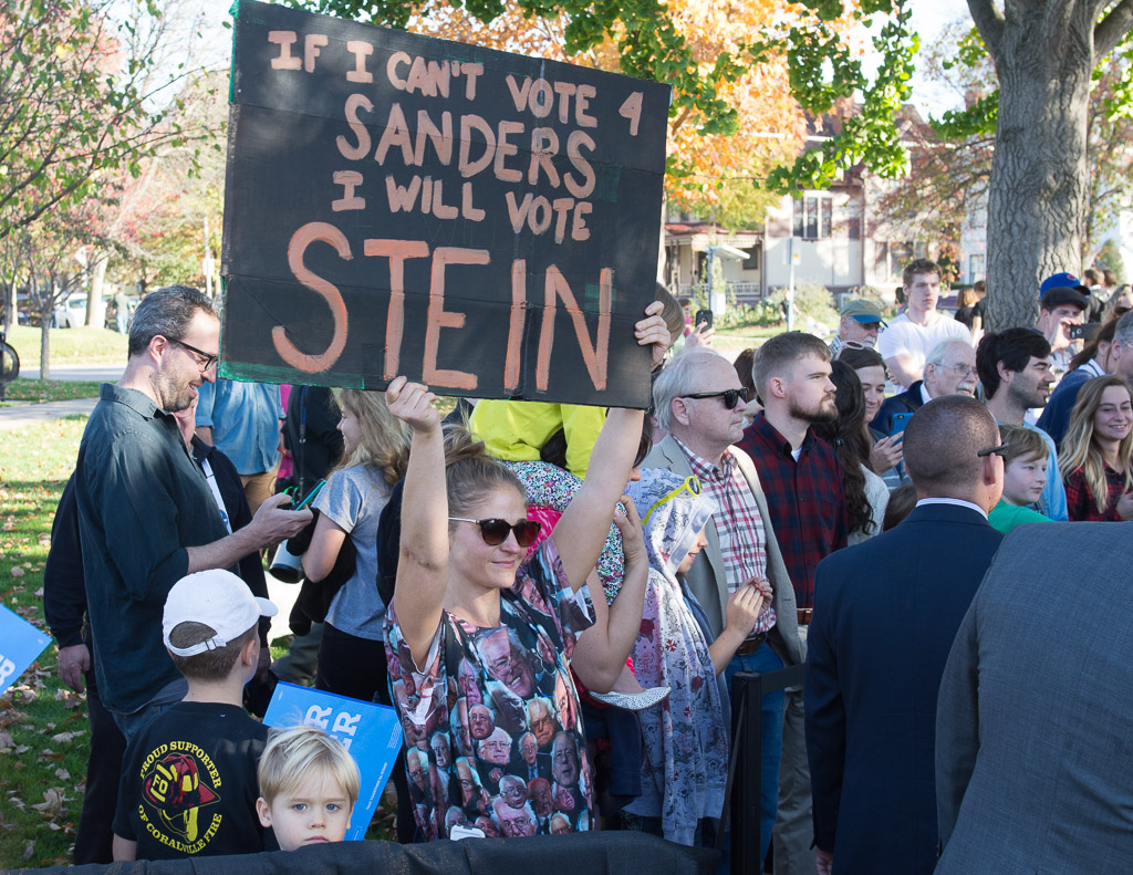 A lone protest in favor of Green Party candidate Jill Stein took place in the crowd at College Green Park. Sanders spoke of the need to rally behind Clinton in order to prevent a Trump presidency. Friday, Nov. 4, 2016. –photo by Zak Neumann.