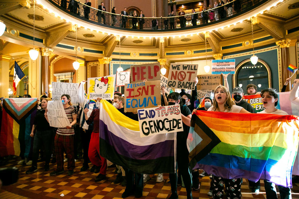 Supporters of LGBTQ rights rally at the Iowa Capitol on Monday, Feb. 12, during a public hearing on HF 2389, a bill that would change how laws and regulations are made in Iowa, permanently undermining the rights of transgender and nonbinary Iowans. — Anthony Scanga/Little Village
