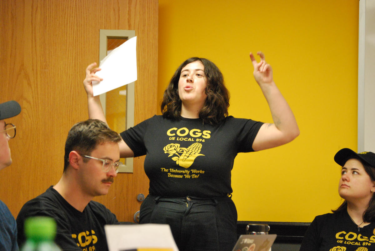 COGS Blue Area (Arts & Liberal Arts) Chief Steward Regina Napolitano speaking about the crowd paid time-off.during the Feb. 6, 2025 meeting with Board of Regents representatives at the IMU. — Kate Doolittle/Little Village
