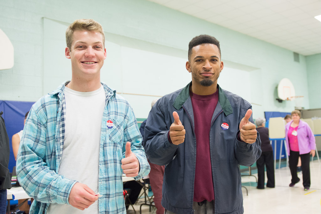 Ben Zerfass and Michael Flowers pose after casting their ballots at Horace Mann Elementary School on Election Day, Tuesday, Nov. 8, 2016. — photo by Zak Neumann