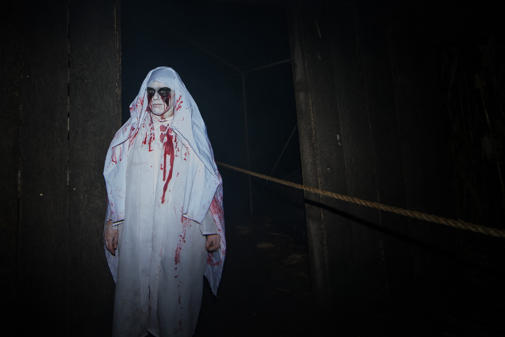 An actress waits for more customers to scare. Friday, Oct. 14, 2016. — photo by Zak Neumann.