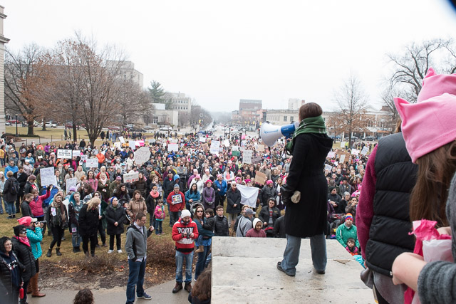 Des Moines Resident Thalia Sutton speaks to the crowd during the Women’s March in Iowa City on Saturday, Jan. 21, 2017. — photo by Zak Neumann