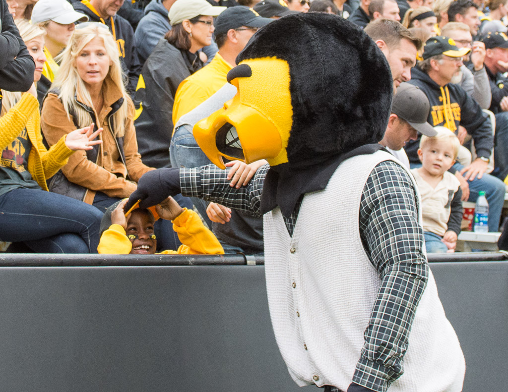 Alumni Herky has some fun with a young Hawkeye fan at Kinnick Stadium. Saturday, Oct. 1, 2016.