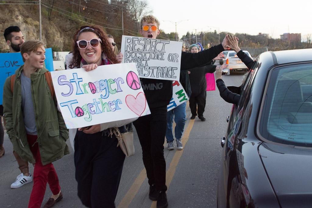 Marchers get encouragement from a passing motorist on North Dubuque St. Friday, Nov. 11, 2016. –photo by Zak Neumann.