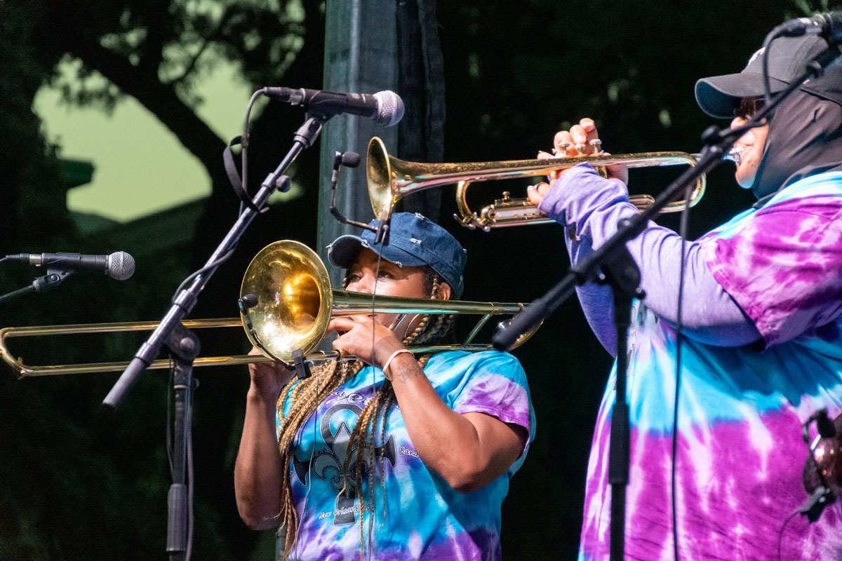 Trombonist Dionne Harrison and trumpet player Careese Williams of The Original Pinettes Brass Band play in sync during a vibrant set at the Iowa Arts Festival, Friday, June 6, 2025. — M.T. Bostic/Little Village