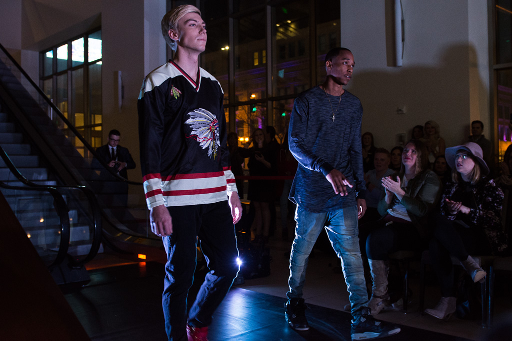 ALMVGHTY designer Dondre Smith (right) walks the runway with one of his brand’s featured looks. Thursday, Dec. 1, 2016. — photo by Zak Neumann.